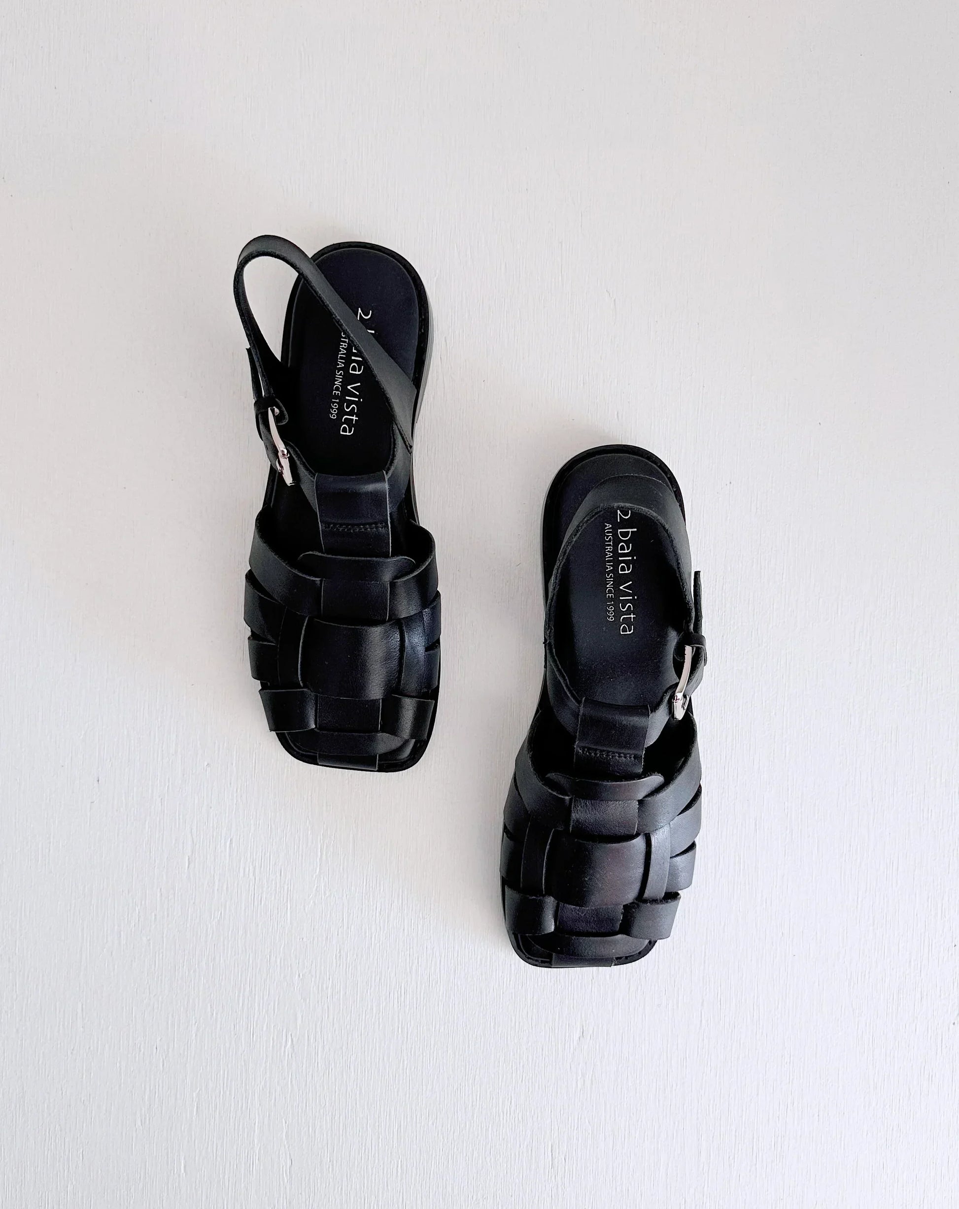 A little bit of luxury with the 2 Baia Vista Fisherman Sandal in Black. The modern interwoven leather cage design pairs perfectly with the T-Bar construction and silver buckle closure. With an ultra cushioned innersole and a flat sole with a slight 2.5cm heel, these black sandals offer both style and comfort. Crafted with soft full grain leather upper and leather lined for an on-trend look.
