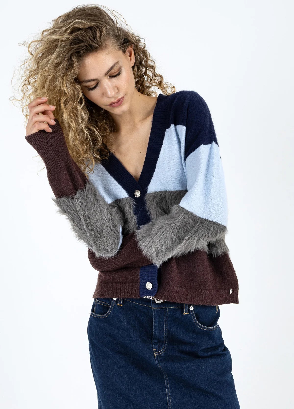 A true favourite in the range the Colourblock Knit Cardigan is back. This time in a gorgeous blue hued mix. Featuring a V-neckline with button through front with ornate silver buttons, long sleeves with extended ribbed cuffs. A single fur knitted stripe through the main body and sleeves gives this piece a quirky touch