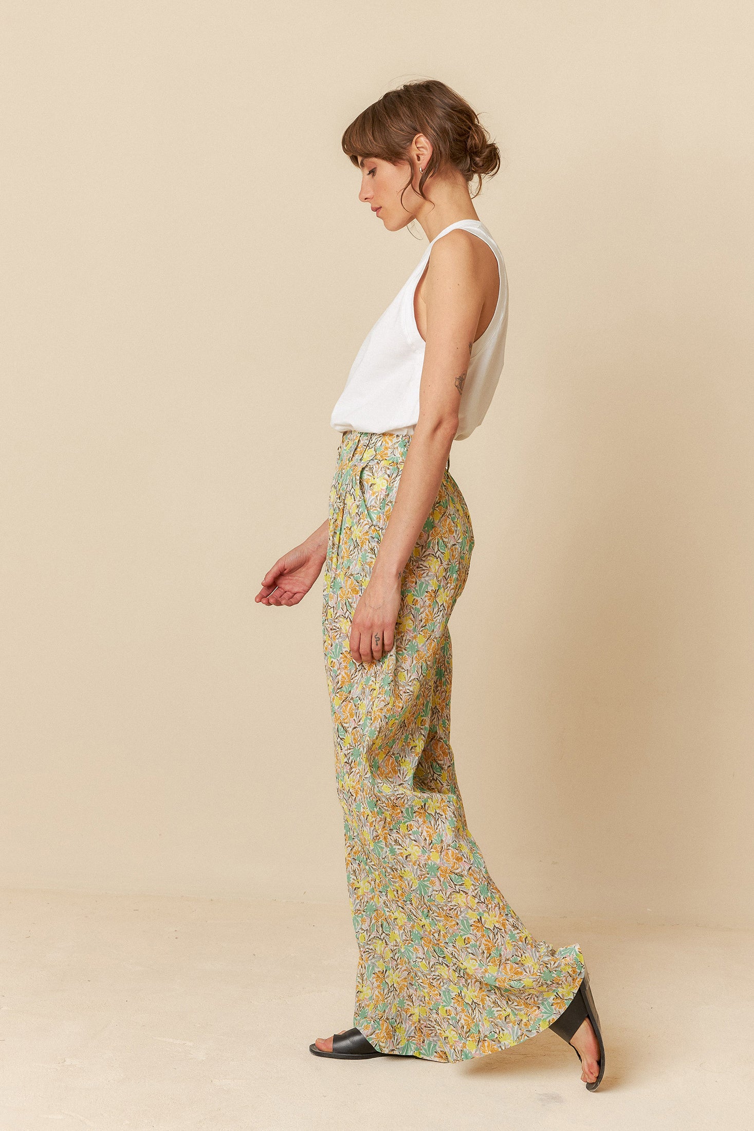 These Indi and Cold Wide Leg Pants with pleats have a contemporary feel. With a high waist with elastic at the back, they offer both comfort and style. The zipper and double-button closure, along with the French-cut and welt pockets, make these functional. An abstract floral digital print fabric and relaxed fit give these pants a modern, casual feel.
