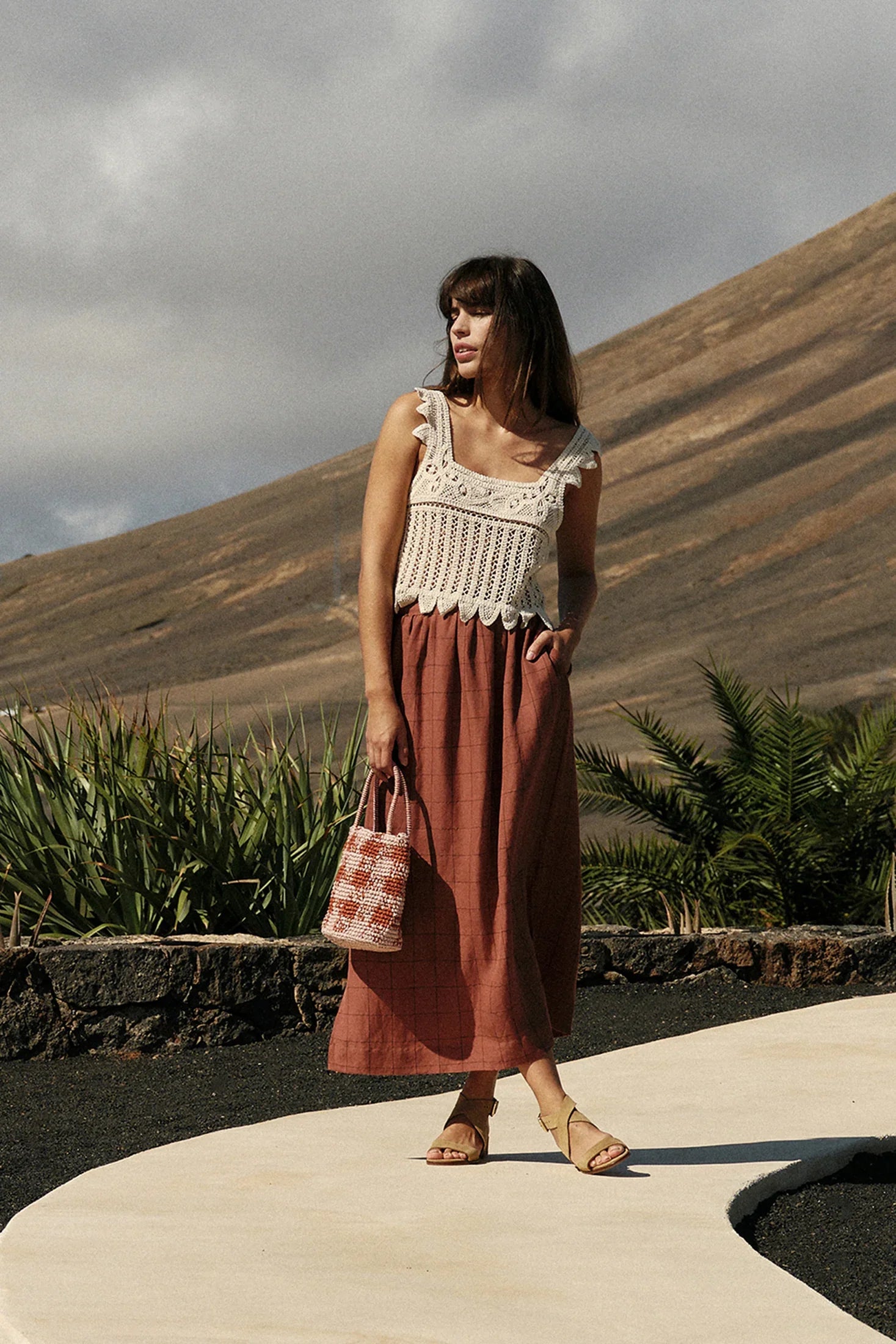 A cotton and linen blend, the Indi and Cold Window Pane Check Skirt has a high waist with a elastic at the back leaving a neat, flat front, hidden seam pockets and side splits.