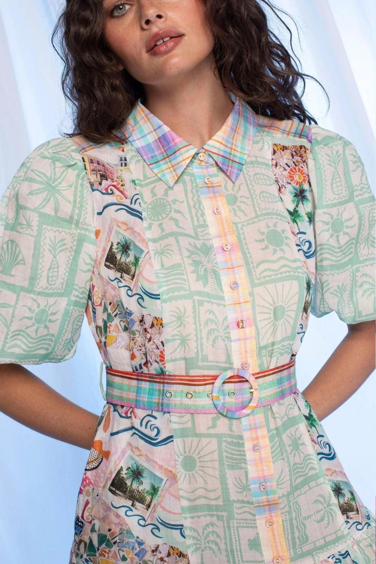The Jean Maxi Dress is a lively and stylish choice, featuring a high collar, short puff sleeves, and a button-up front. An adjustable belt shapes the waist, forming a flattering A-line silhouette that's perfect for capturing those picture-perfect moments.