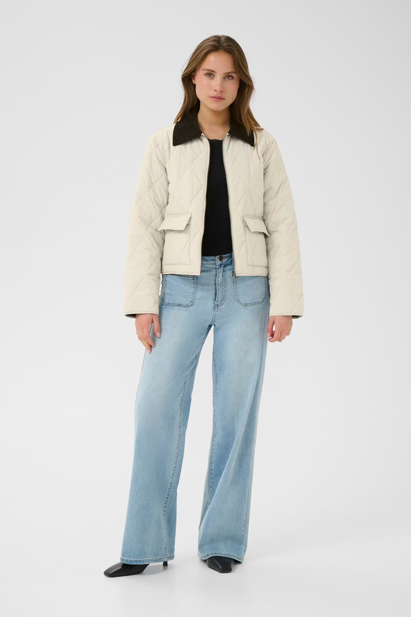 The Kaffe KAanneli Quilted Jacket Feather in Grey has a straight fit and cropped length, it features a contrasting classic collar, full zip closure, and two large flap pockets. This jacket is your go-to for a modern casual style, effortlessly combining comfort and fashion for the cooler months. Embrace the versatility it offers, making it perfect for layering or wearing solo!