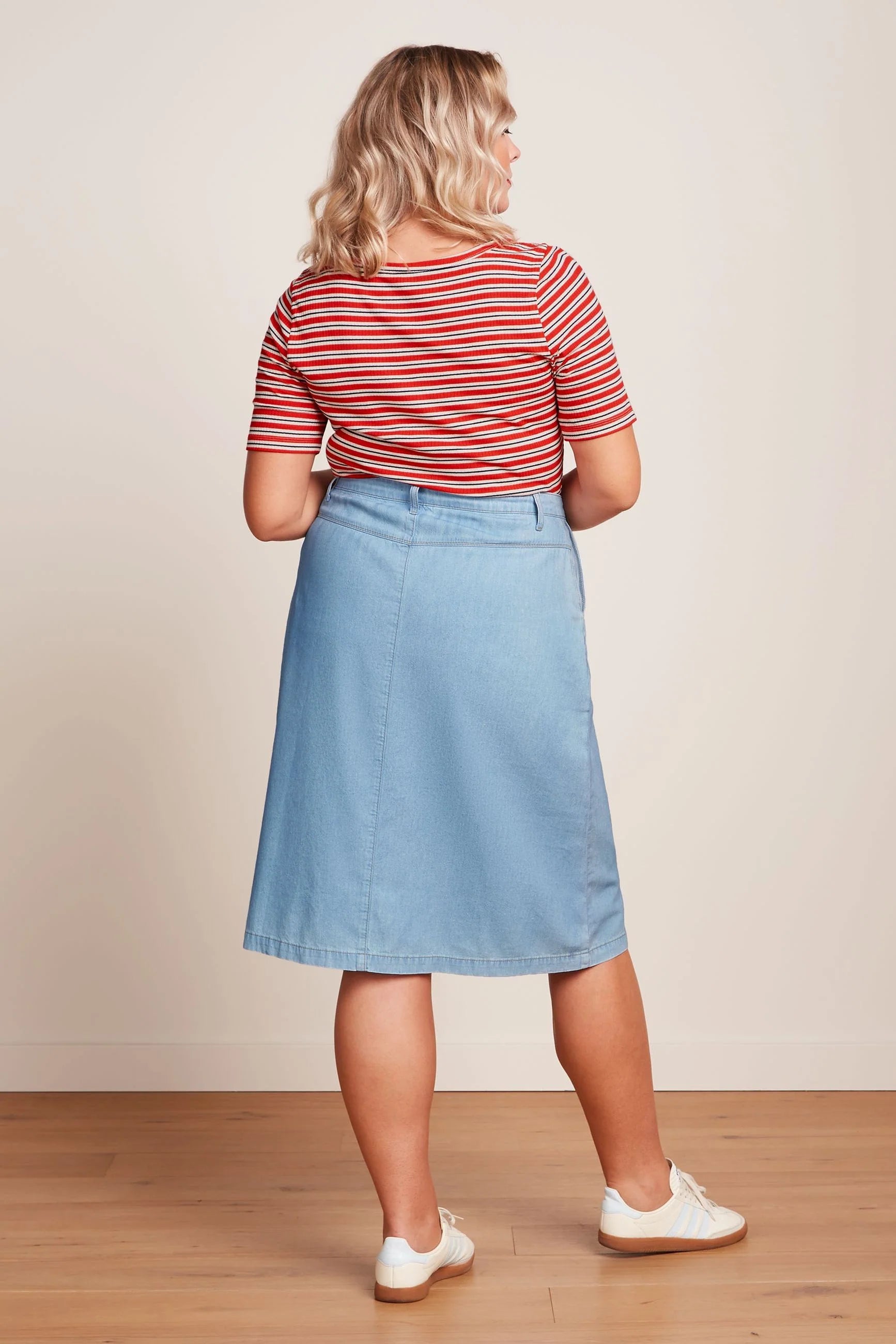 Experience effortless style with the King Louie Marie Skirt Festa Light Denim. This woven twill skirt features side pockets for convenience and a waistband with belt loops for a flattering fit. The flared, midi design adds a touch of elegance, and the GOTS certified organic cotton ensures both comfort and sustainability.Â
