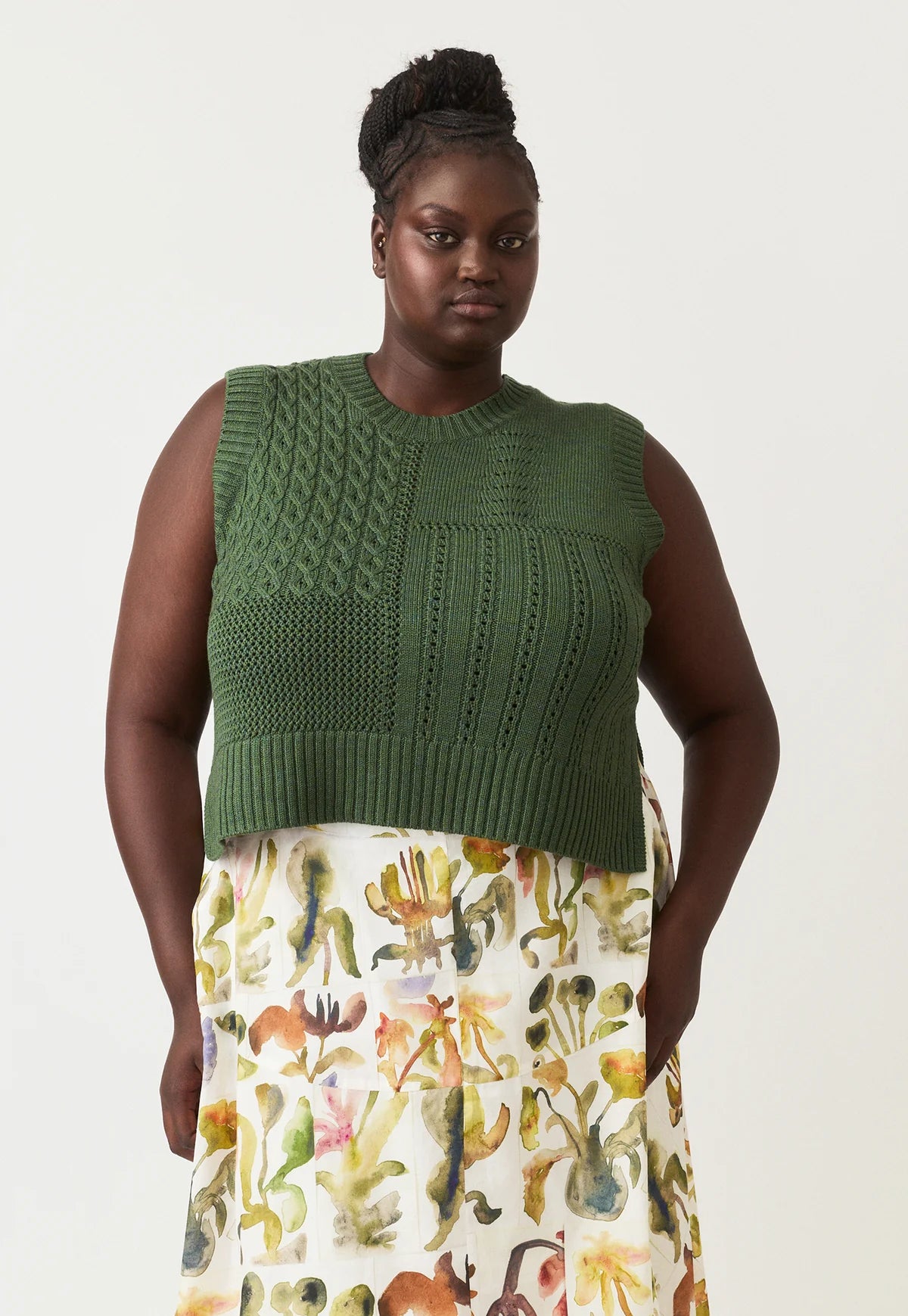 The Nancybird Billie Cable Vest in fine soft wool with its patchwork of knitted details is a classic style perfect for layering.