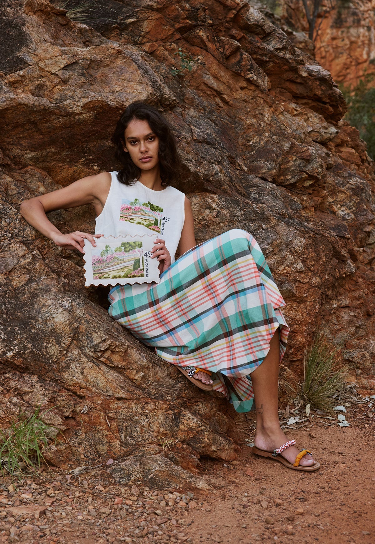 Created in collaboration with Iltja Ntjarra Art Centre, we feature the artwork of Selma Coulthard, whose Postage Stamp artwork adds a joyful rhythm to this capsule of pieces.