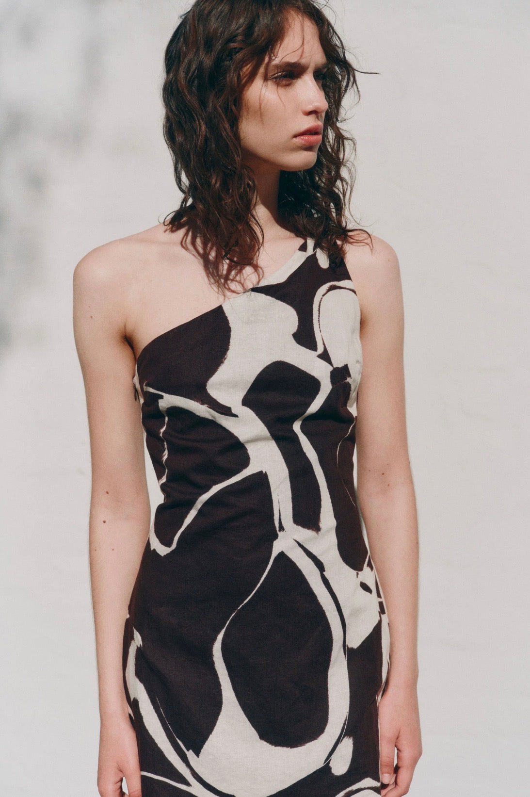 The Nude Lucy Ombra Mini Dress is made from a linen blend fabrication in an exclusive Ombra print. The silhouette is feminine with one thick shoulder strap, fitted waist and mini A-line skirt. Features include shoulder strap twist detail, gripper tape on inside neckline and invisible zipper. This dress is fully lined.
